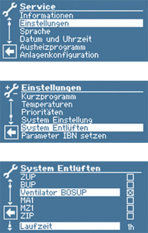 Norėdami tai padaryti, eikite į Service > Settings > Vent system ir pažymėkite BOSUP ventiliatoriaus langelį. Ventiliatorius įsijungia iš karto po patvirtinimo. Jis veikia visą nustatytą laiką arba gali būti baigtas rankiniu būdu panaikinus varnele Fan BOSUP.